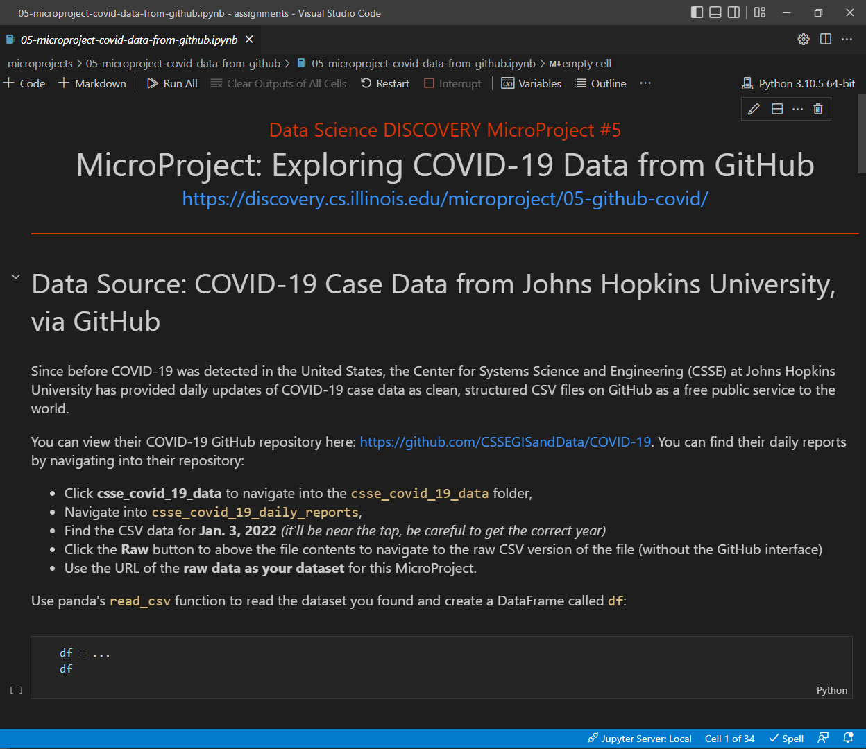 git merge microprojects/microproject-vault-03-covid-data-from-github --allow-unrelated-histories -m "Merging initial files"Complete the Notebook